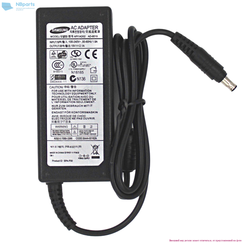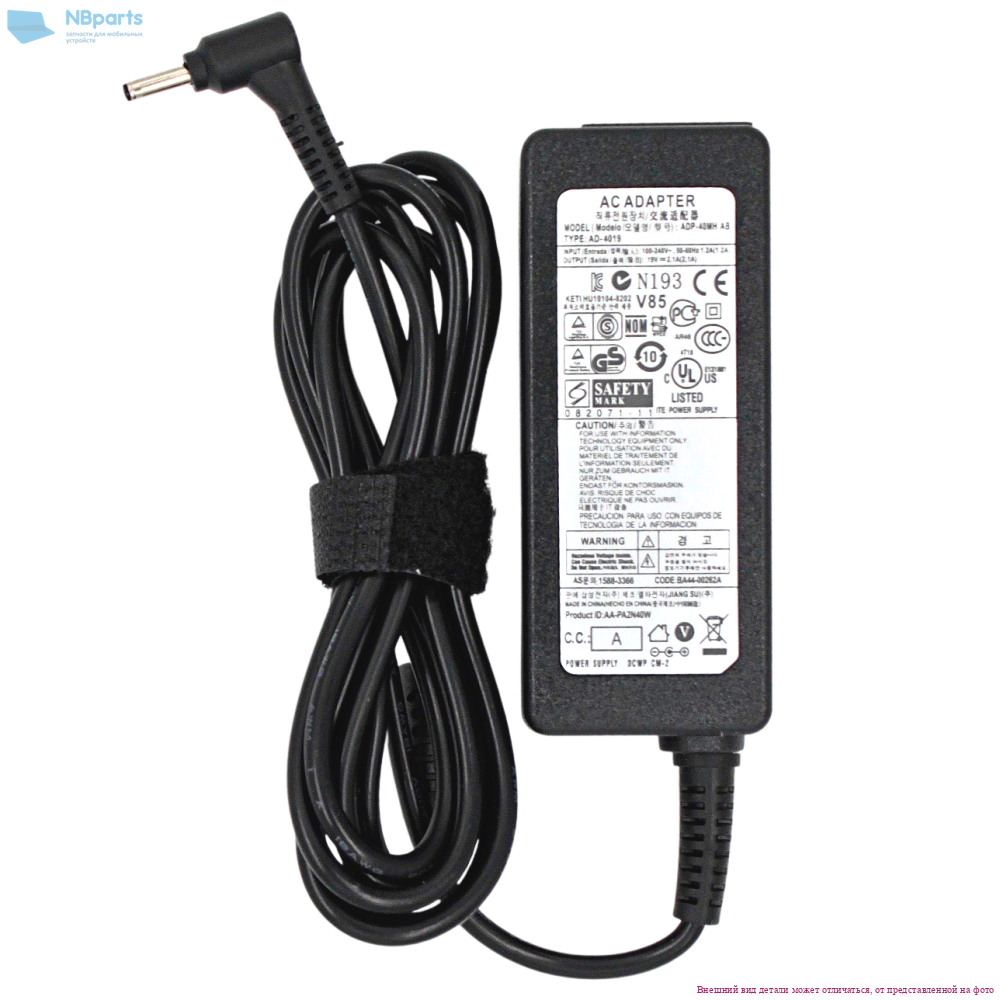 Блок питания (зарядное устройство) для ноутбука Samsung 40W, 19V 2.1A, 5.0x3.0, AD39-00028A, копия без сетевого кабеля